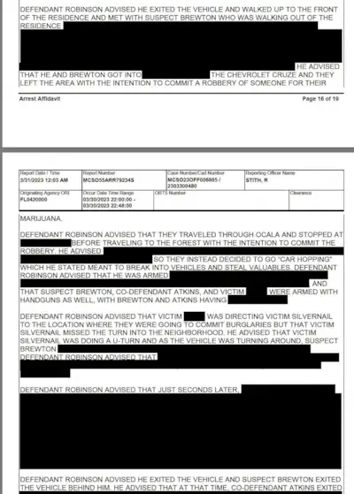 Robinson behauptete, dass eines der anderen Opfer als Silvernail (aus den Dokumenten geht nicht hervor, wer es war, aber sie stellten fest, dass eines der Opfer bereits am 15. März auf Bildern mit Robinson und Atkins zu sehen war) „Opfer Silvernail zu dem Ort geleitet hat, an dem sie Einbrüche begehen wollten, aber dieses Opfer Silvernail die Abzweigung in die Nachbarschaft verpasst hat.“ Er teilte mit, dass das Opfer Silvernail eine Kehrtwende machte, bevor sie getötet wurde.