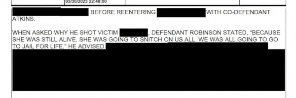In eidesstattlichen Erklärungen zur Unterstützung der Anklage wegen Mordes ersten Grades sagten die Abgeordneten von Marion County, ein Zeuge sei identifiziert worden Atkins Und Robinson unter ihren „Straßennamen“ „35“ und „Reaper“.