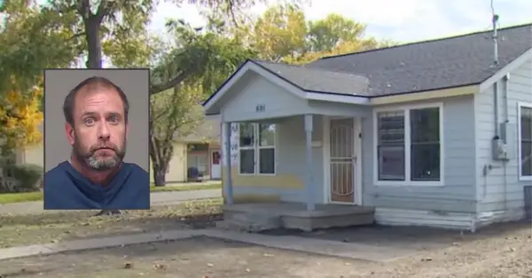 Das Haus in McKinney, Texas, wo die Überreste von Heather Schwab gefunden wurden (via YouTube-Screengrab/WFAA). Einschub: Chad Christopher Stevens (über das Gefängnis von Collin County (Texas).